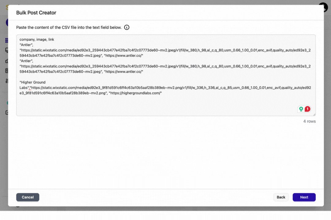 Paste your spreadsheet data by copying and pasting the CSV text from your spreadsheet. Click Next to generate your posts.
