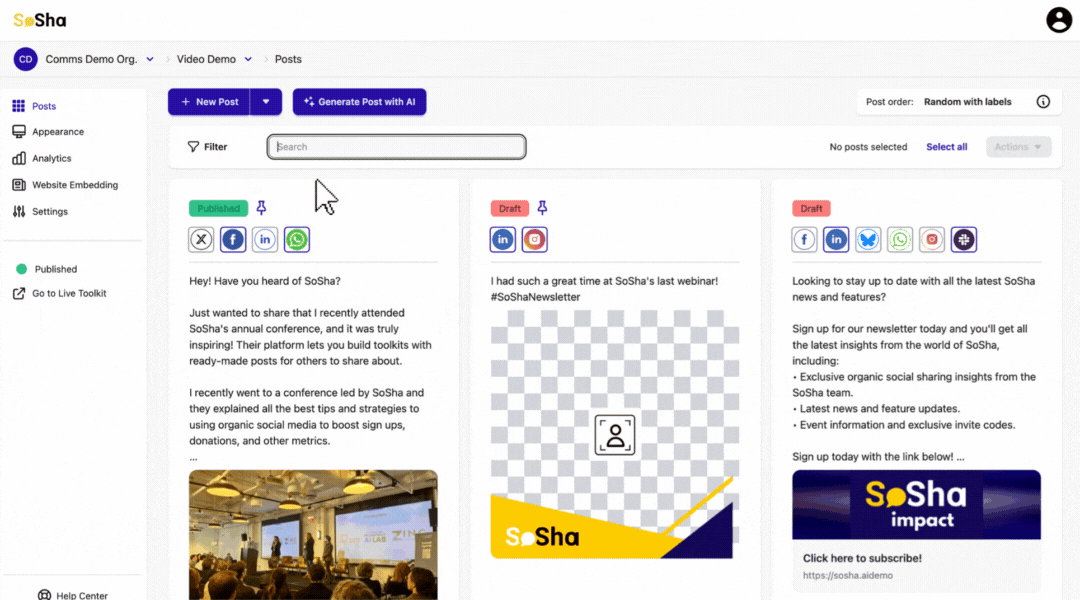 Easily find posts when editing your toolkit using filters or the search bar located below the “+ New Posts” button.