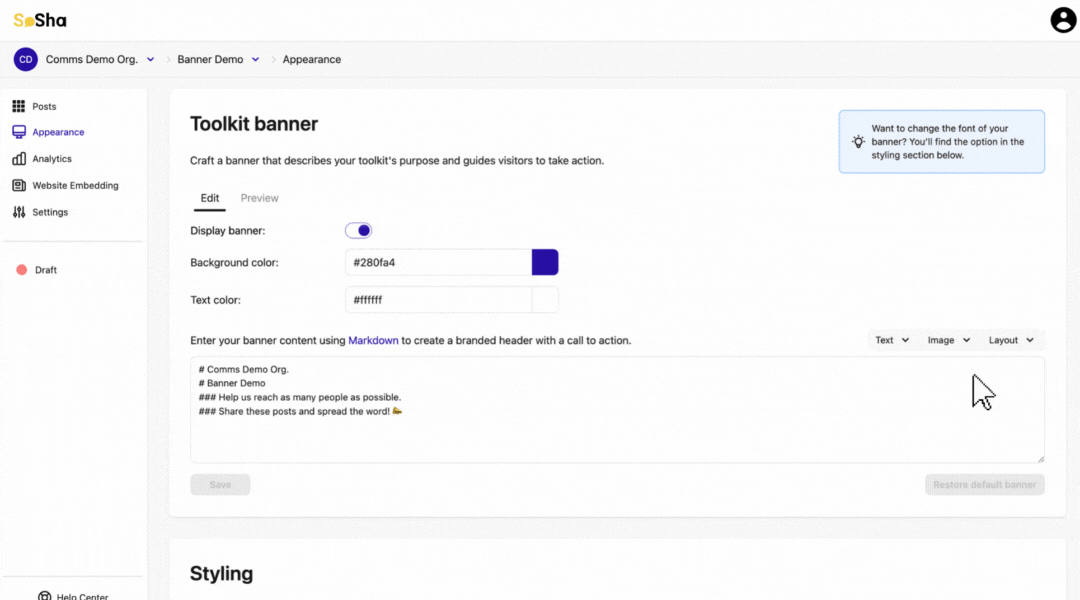 You can add images to your toolkit banner by either uploading a file directly or using a public image URL. Both options use Markdown and let you preview your design before saving.