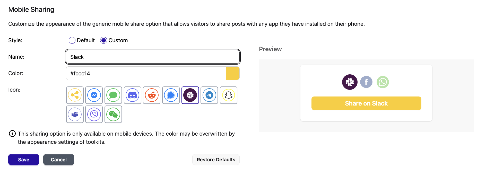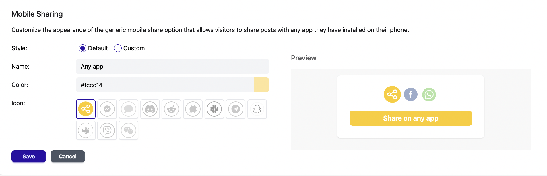 The "All Apps" button is the mobile share option that lets visitors share posts to any app installed on their phone. You can customize this button to display a specific app (like Slack, Discord, or Reddit), and update its appearance under your organization’s settings.