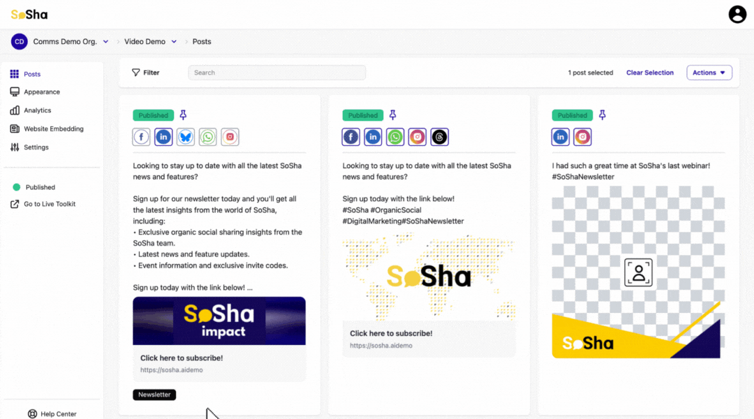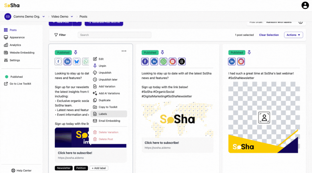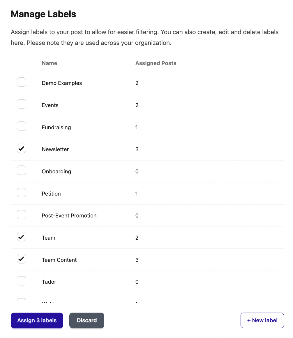 Labels can be assigned to your posts for easier filtering. Many organizations use labels to group posts by theme or audience. Labels are universal across your organization's settings.