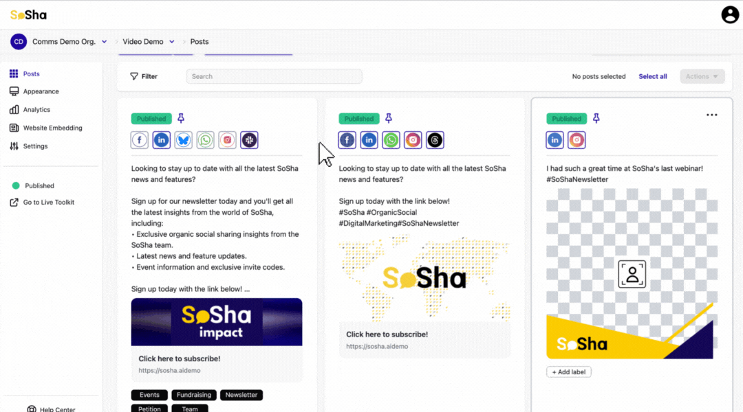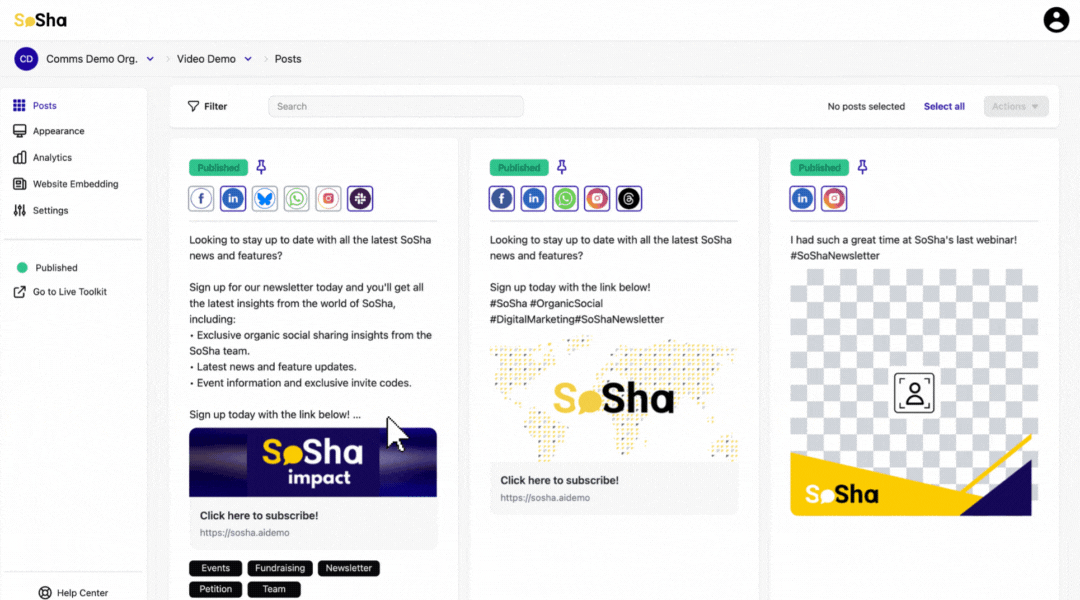 For a post to be visible and shareable on a toolkit, it must be published. Posts that are not published will not show up on the live toolkit and will be unavailable to audiences to customize and share.